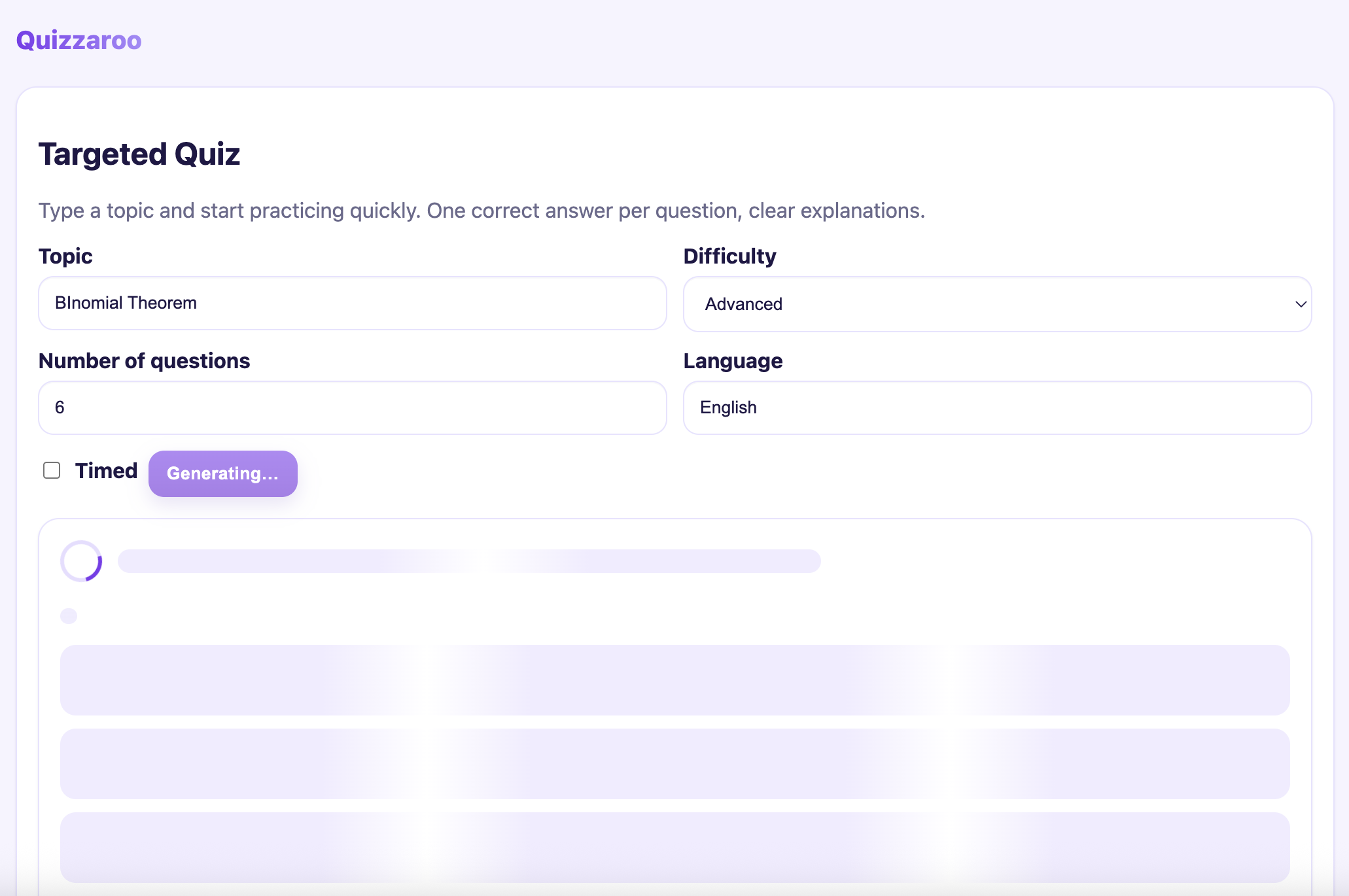 • Hello, Targeted Quiz — learners describe the concept they want to drill (e.g., “Binomial theorem at JEE Advanced difficulty”). Quizzaro calls Azure OpenAI with a JSON-schema prompt, generates questions + distractors, and auto-grades with reasoning. Missed an item? Hit Practice similar to missed and it loops in variations focused on the weak spots.